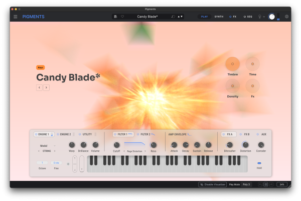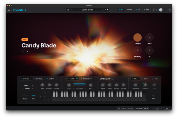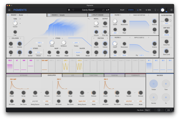 Explore a vast sonic universe thanks to Pigments' multi-engine architecture and advanced modulation options. From shimmering pads and moving textures to biting basses and punchy leads, its simplified presets and controls allow you to quickly play and edit complex sounds while maintaining a deep design perspective.