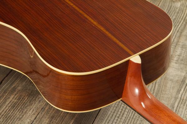 Its flawless solid lutherie is made from the best sounding and most beautiful tonewoods : torrefied Sitka Spruce top, east indian Rosewood back/sides, "Pre-war Scalloped" bracing, Mahogany neck and Ebony fingerboard / bridge.