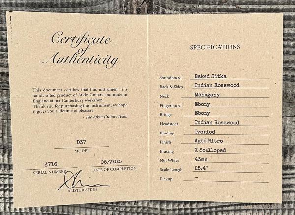 Hand built in England in very small quantities, ATKIN D37 #3716 acoustic guitar is a magnificent "Square Shoulders" Dreadnought, that looks and reacts as a true vintage instrument.