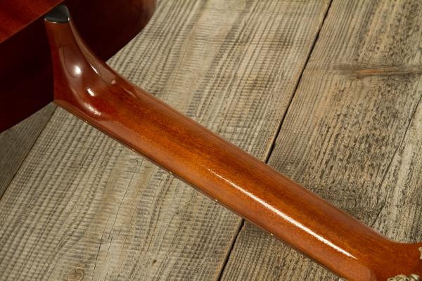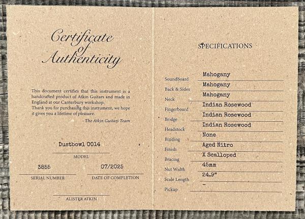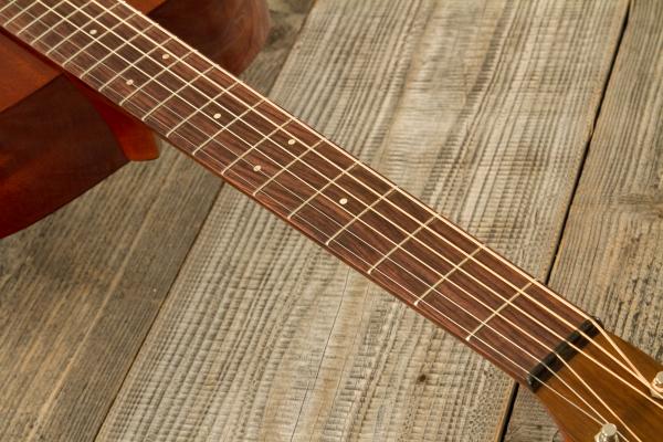 ATKIN Dust Bowl OO14 #3855 is inspired by some of the depression era guitars of the 1930’s. A lightweight all-mahogany body construction, scalloped braces, and soft-V neck carve that hugs your hand. The 16? radius Indian Rosewood fingerboard with rounded-over edges makes ‘thumb-overtop’ playing easy and comfortable.