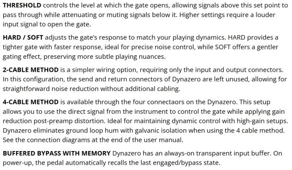 4-cable method is available through the four connectors. This setup allows you to use the direct signal from the instrument to control the gate while applying gain reduction post-preamp distortion. Ideal for maintaining dynamic control with high-gain setups. Dynazero eliminates ground loop hum with galvanic isolation when using the 4 cable method