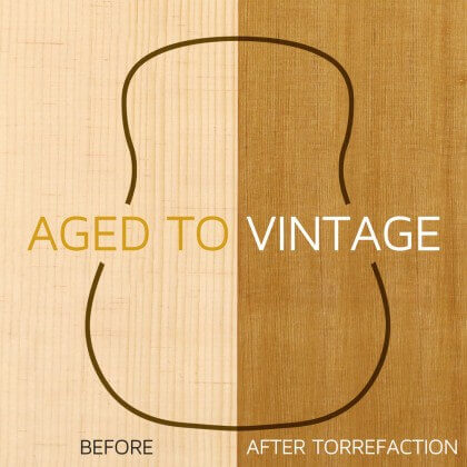 “AAA” Grade cocobolo and “AA” Grade torrefied spruce combine with mahogany, walnut, and ebony in a masterful tonewood combination, each selected as much for appearance as tonal qualities.