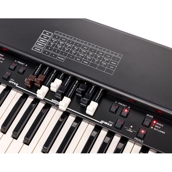 6 preset sounds: VB3-II (wheel organ), pipe organ, Compact Deluxe, Continental, Tine Piano, Piano Reed, acoustic keyboard and EP clavinet modeling