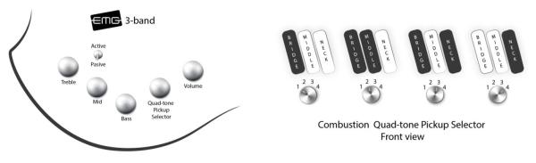 - Vol, rotary pickup selector, Bass, Mid, Treble, Active/Passive switch