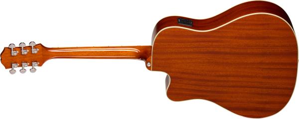 The Hummingbird Studio EC features a layered mahogany body with six-ply antique ivory and black binding on the top and four-ply antique ivory and black binding on the back, complemented by a solid spruce top for a responsive, balanced tone with excellent dynamic range that will sound even better as it ages. The mahogany neck is joined to the body with a glued-in tapered dovetail neck-to-body joint and features a Rounded C profile that ensures comfortable playability. The neck is capped with a bound rosewood fretboard equipped with 20 standard frets and adorned with the classic split parallelogram inlays that are one of the hallmarks of the Hummingbird design. The other ends of the strings run over a compensated plastic saddle and anchor to the belly-up rosewood bridge with ivory-colored bridge pins. Other details that give the Hummingbird Studio EC even more vintage-style visual appeal are also included, such as a Hummingbird tortoise shell-colored pickguard with iconic Hummingbird graphics, high-quality Grover® Rotomatic® tuners for precise and stable tuning, and a 60s Kalamazoo-style headstock with the Epiphone logo and Gibson Crown prominently inlaid in mother of pearl. The Hummingbird Studio EC is equipped with Fishman™ electronics, including an S-Core under-saddle pickup and Fishman Presys II preamp with side-mounted volume, bass, treble, and phase controls. It also has a convenient built-in electronic tuner, making it quick and easy to get tuned up. The Epiphone Hummingbird Studio EC has a gloss finish and is offered in two vintage-inspired colors—Natural and Heritage Cherry Sunburst. Both right and left-handed versions are available. A standard gig bag is also included.