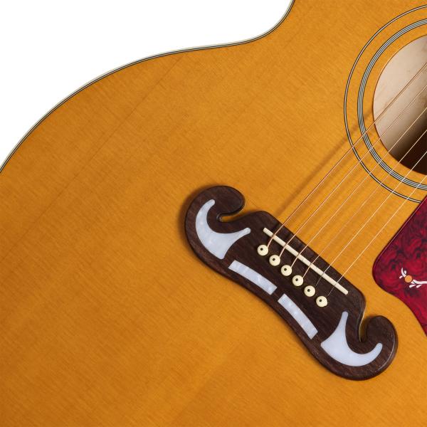 Are included other details that give the J-200 Studio even more vintage-style visual appeal, including a classic J-200 style tortoise shell-colored pickguard with the legendary two-color J-200 graphics, Epiphone Deluxe tuners with Keystone buttons, and a bound 60s Kalamazoo-style headstock with the Epiphone logo and Gibson Crown proudly displayed in mother of pearl. The J-200 Studio comes with Fishman® electronics, including an S-Core under-saddle pickup and Fishman Presys II preamp.