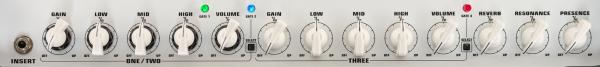 - Individual controls for channels 1 & 2 (concentric potentiometers) : Volume, Gain , Low, Mid, High, Gate