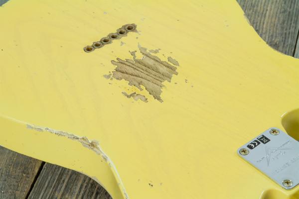 Developped around a "1952 Telecaster" Base Model,FENDER Custom Shop Time Machine 1953 Telecaster Heavy Relic Aged Nocaster Blonde #R126760 (9236080870) solid body electric guitar features 2-pieces sort for "lightweight" Ash body, quarter-sawn AA flame Maple neck and fretboard (1954 U, profile, narrow-tall frets, compound 7.25/9.5" radius), Custom Shop Hand-wound Twisted Tele (neck) and Original Blackguard (bridge) pickups, traditional/vintage-style parts.