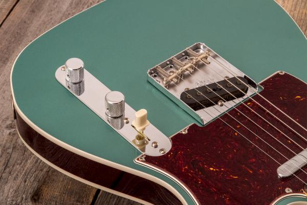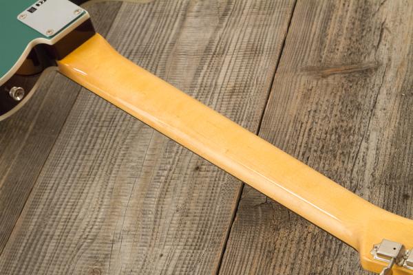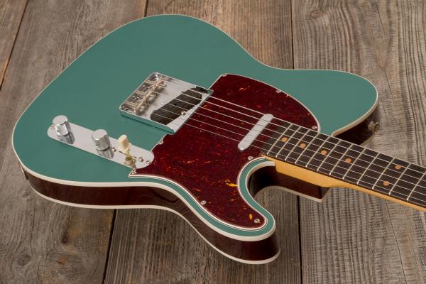 Developped around a "1960 Telecaster Base Model",FENDER Custom Shop Time Machine 1959 Telecaster Custom Time Capsule Sherwood Green #R146446 (9237002904) solid body electric guitar features 2-pieces "sort for lightweight" Alder body, quarter-sawn Maple neck and AAA "sort for dark" Rosewood fretboard (1959 Large C profile, narrow-tall frets, 9.5" radius), Custom Shop Hand-wound '58 Tele pickups and traditional/vintage-style parts.