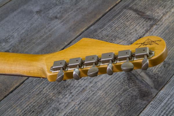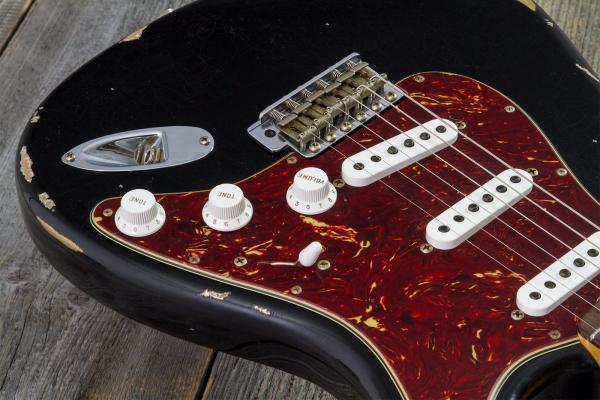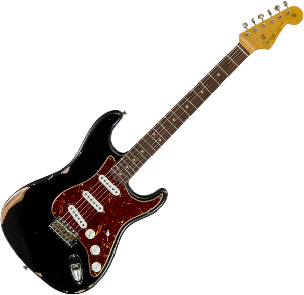 Developped around a "1960 Stratocaster Base Model",FENDER Custom Shop Time Machine 1963 Stratocaster Relic Black Over HLE Gold #R143861 (9237003351) solid body electric is the reinterpretation of a typical mid-sixties typical Strat. It merges vintage and modern specs.