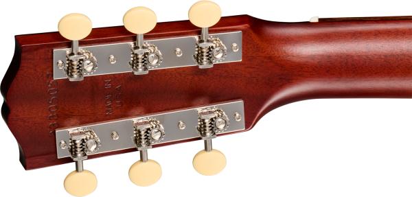 traditional acoustic builds. A rosewood fretboard carries 19 frets and simple mother-of-pearl dot inlays. Up top, the headstock is fitted with open-back Golden Age strap tuners with cream buttons and dressed with an early-1900s-style Gibson script logo decal. A sloped rectangle closed-slot rosewood bridge—echoing those found on the earliest J-45 models—adds another vintage-inspired touch. The guitar features a bone nut and saddle, TUSQ® bridge pins, a classic Gibson L-00-style pickguard, and a hand-sprayed satin nitrocellulose lacquer finish. Each J-45 Century 12-Fret ships in a premium Century Collection tweed hardshell case and is