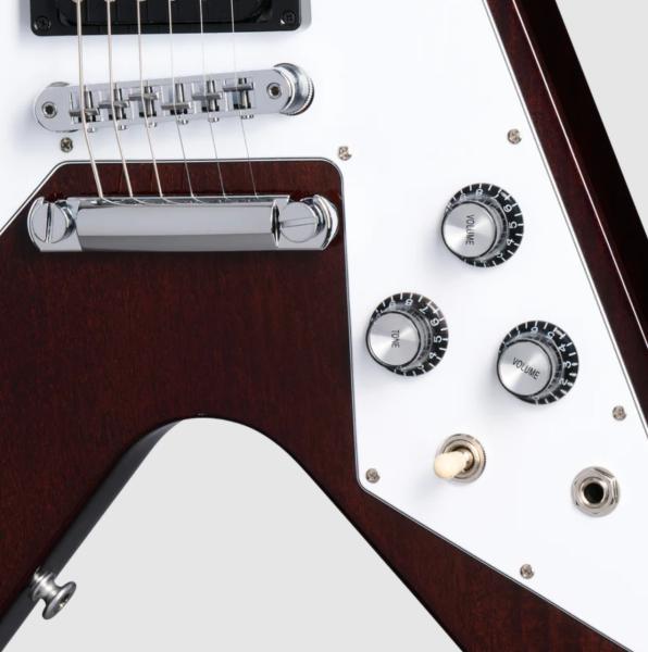 GIBSON Original Collection '70s Flying V (DSVS007WCH3) solid body electric guitar, with its bound rosewood fingerboard, slim taper neck, and a pair of uncovered ‘70s tribute burstbuckers all hand wired with Orange Drop capacitors, is set to nail all of the classic tones of the era. This guitar ready to rock any arena stage.
