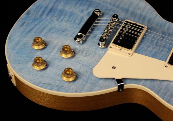 It boasts a solid mahogany body, an AA figured maple top, and a distinctive translucent custom color nitrocellulose lacquer finish that showcases the figured maple top. The mahogany neck has a rounded 50s Vintage profile and a rosewood fingerboard with trapezoid inlays. The Les Paul Standard 50s Figured Top is equipped with an ABR-1, the classic-style Tune-O-Matic™ bridge, an aluminum Stop Bar tailpiece, Vintage Deluxe tuners with Keystone buttons, and gold Top Hat knobs. The calibrated Burstbucker™ 1 (neck) and Burstbucker 2 (bridge) pickups are loaded with Alnico 2 magnets and wired to audio taper potentiometers and Orange Drop® capacitors. A hardshell case is also included.