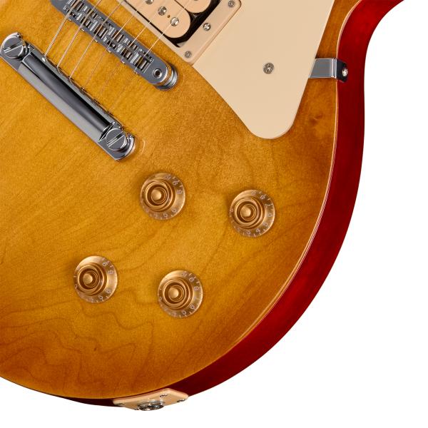 It sets itself apart from the regular Les Paul Studio with features that include an Ultra Modern weight-relieved Mahogany body with Maple cap, a mahogany neck with a bound Rosewood fretboard, SlimTaper™ profile, Grover® Rotomatic® tuners with GibsonVintage Deluxe tuning machines, and Gibson Burstbucker Pro pickups wired to individual push/pull volume controls for coil tapping and a wide range of tonal options.