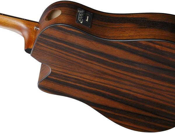 IBANEZ Advanced Acoustic AAD70CE TBN is a "Grand Dreadnought" cutaway acoustic/electric guitar featuring solid Sitka Spruce top, layered Macassar Ebony back/sides, Okoume neck, Purpleheart fretboard and Ibanez AEQ-TP2 preamp w/Onboard tuner.