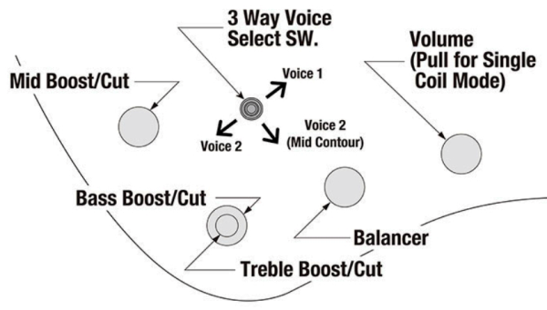 - Fishman® 3-band EQ w/Single Coil Mode switch (push/pull), 3-way Voice Select switch