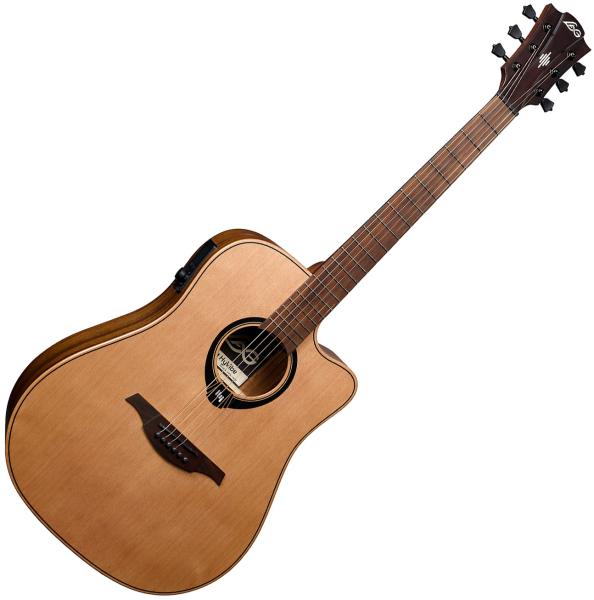 The very attractive and comfortable LAG Hyvibe HV10DCE is an Dreadnought steel string acoustic/electric guitar featuring solid Cedar top, layered Khaya back/sides/neck and Brown Brankowood fingerboard/bridge. It benefits from excellent craftmanship, and provides warm, rich and dynamic sounds.