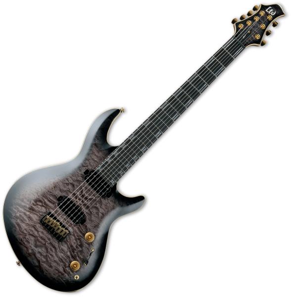 Introduced in 2021, the LTD Signature Javier Reyes JR-7 is a 7-string version of Javier’s well-known 27” baritone scale ESP signature guitar. It offers neck-thru-body construction for stability and sustain, a swamp ash body, quilted maple top, and a 5-piece walnut/maple/padauk neck with Macassar ebony fingerboard. It features a custom inlay pattern in white pearloid, 24 extra-jumbo frets, and glow-in-the-dark side markers.