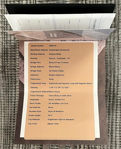 It features Solid premium Sitka Spruce top, solid guatemalan Rosewood back/sides, genuine solid Mahogany neck with Modified Low Oval and High Performance Taper profile and Ebony fretboard.