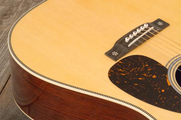 Sitka Spruce is the traditionnal choice for top wood on most acoustic guitars. Offering combination of strength and elasticity which translates into a broad dynamic range, Sitka Spruce has a punchy direct sound, yielding crisp articulation and allowing for versatile playing, from dynamic strumming, flatpicking or fingerpicking.