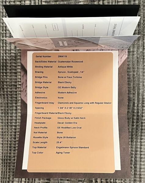It features Solid Engelamnn Spruce top and bracing, solid guatemalan Rosewood back/sides, genuine solid Mahogany neck with Modified Low Oval and High Performance Taper profile, Ebony fretboard.