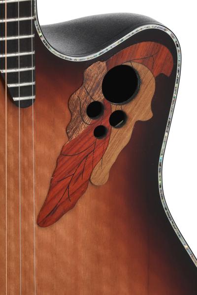 The electro-acoustic signal processing begins with an Ovation Slimline pickup at the bridge, distinguished by its narrow shape. The notched bridge increases the pressure point on the piezoelectric crystals, resulting in a particularly even tone. Before leaving the guitar, the signal is further refined by an Ovation OP4BT preamp with a 3-band EQ and a built-in tuner.