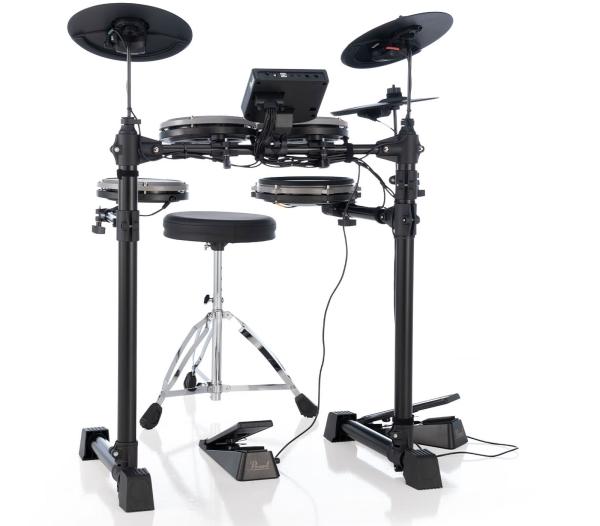 Every element of the kit has been designed to reproduce the feel of an acoustic drum kit at its best, while maintaining a very low volume. The double-layer mesh pads offer a natural bounce and precise response, allowing you to work on your technique with comfort and realism. The double-zone snare drum allows you to execute rimshots, cross-sticks and dynamic nuances with great fidelity, considerably enriching the expressiveness of your playing. The rubber cymbals, meanwhile, react quickly and absorb vibrations, guaranteeing a pleasant feel and optimum control.