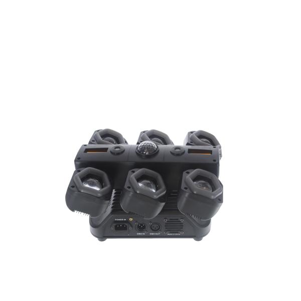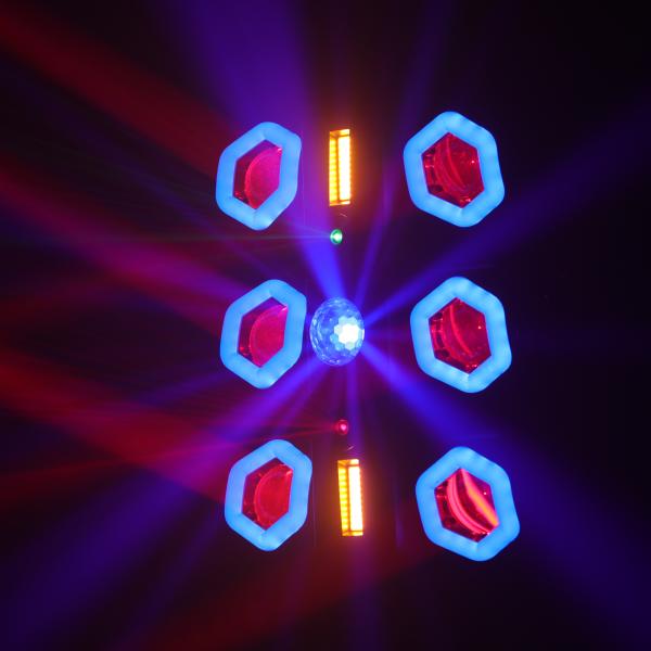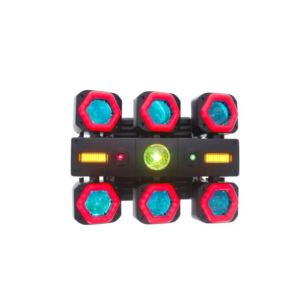 It combines several technologies to create a rich, immersive animation: 6 RGBW 15W LED projectors, RGB LED rings, integrated strobes, a red & green laser and a rotating sphero.