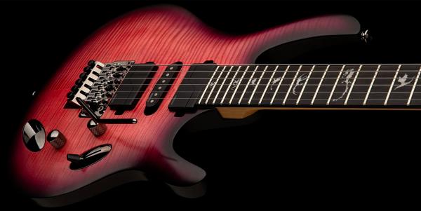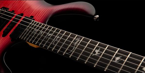 The PRS SE Chleo features a maple top and mahogany back with maple neck and ebony fretboard. The body features a sculpted carve that allows it to be very thin and very lightweight overall, so you can play longer and with more energy. The neck shape and neck joint were specially designed to be comfortable and fast. The neck is very thin front-to-back with a slightly taller playing surface and 20” fretboard radius, and the added high-modulus carbon fiber strength rods ensure a strong neck that promotes sustain. The fretboard features “Eclipse Dragon” inlays, and PRS’s trademark scoop has also been modified for ultimate access to the upper frets. All this plus a Floyd Rose locking tremolo mean you can dig in and play hard without sacrifice.