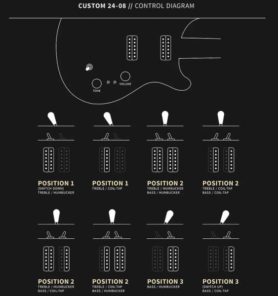 Featuring mini-toggle coil split switches, the Custom 24-08 has eight different pickup settings that provide an array of humbucking and singlecoil tones, including a dual singlecoil option unique for this model. For classic PRS playability, reliability, and tone with ultimate flexibility, check out the Custom 24-08.