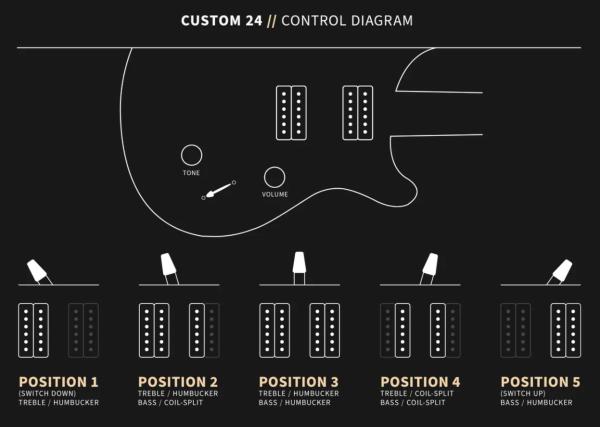 The Custom 24 is outfitted with PRS DMO treble and bass pickups with volume and tone controls and a 5-way blade switch. DMO (Dynamic, Musical, Open) pickups were personally designed by Paul Reed Smith and the PRS New Products Engineering team. These pickups incorporate every detail of pickup knowledge PRS has gained in recent years of R&D.