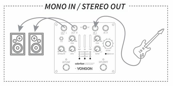 The DETUNE section delivers a wide stereo chorus by pitch-shifting the left and right channels in opposite directions. The detune amount can be dynamically modulated by the input envelope, so the stereo spread responds to your playing, ranging from gentle shimmer to dramatic detuning