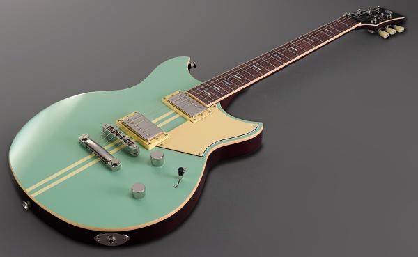 YAMAHA Revstar Standard RSS02T (Sonic Blue) is a chambered solid body electric guitar, featuring a Mahogany body, Maple top, a three pieces Mahogany set-neck with 22 stainless steel frets Rosewood fretboard (scale 24.75"), AlNiCo V P90 style single coil pickups and tone pot with push-pull "Focus Switch" which activates a passive boost with an effect similar to overwound pickups — darker highs, increased mids and lows, and an aggressive character.